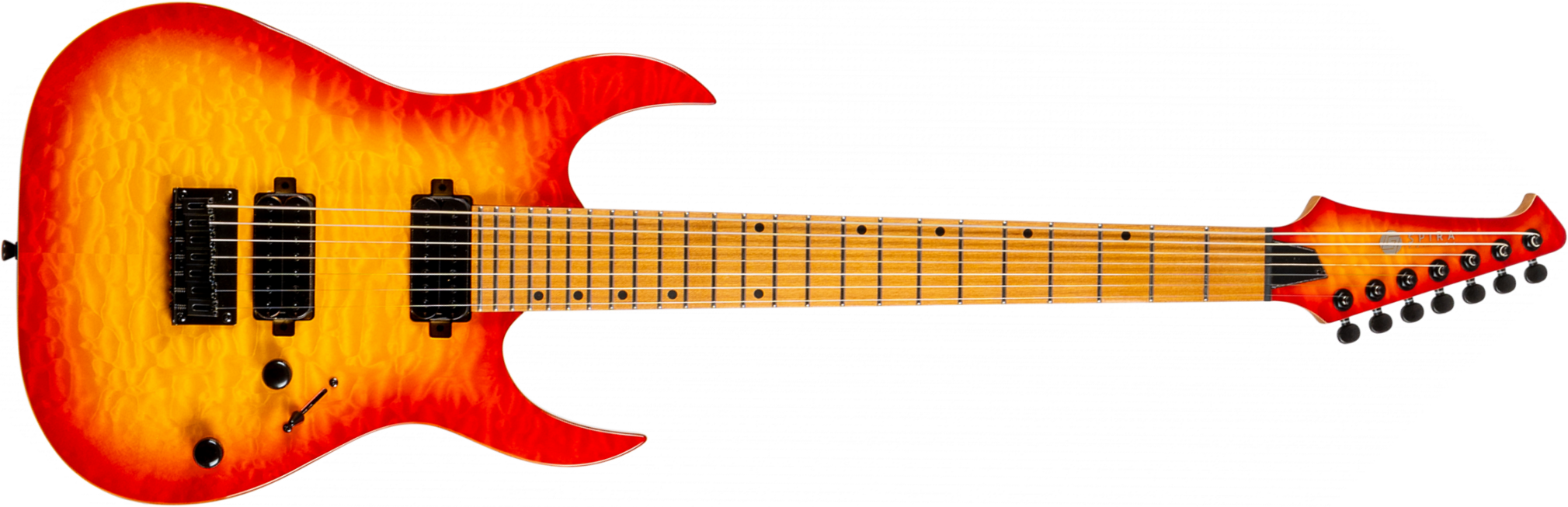Cette sept cordes avec diapason baryton (26.5") est pourvue d'un corps en Acajou, d'un manche vissé en Erable torréfié, d'une touche en Erable torréfié sertie de 24 frettes, de redoutables micros double-bobinage Spira Villain avec aimants céramique, et d'un chevalet fixe.
