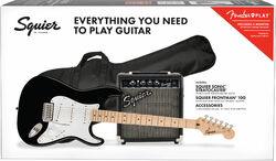 Le SQUIER Sonic Stratocaster Pack (0371720603) est constitué d'une guitare électrique solidbody, d'un ampli Fender Frontman 10G combo (10w, sortie casque et entrée Aux In pour lecteur MP3), d'une housse, d'un câble, de médiators et d'une sangle.