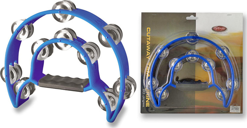 Le tambourin demi-lune en plastique STAGG TAB-1 de couleur bleue, avec 20 cymbalettes est un instrument de percussion à main pour petits et grands.