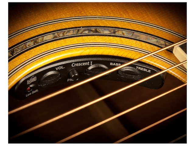 Une guitare dotée de charme et de fonctionnalité. Le système B-Band Crescent dont les contrôles sont accessibles dans la rosace comprends volume, basse, aigu, phase et indicateur "Low Battery" (alimentation par pile 9-volts).