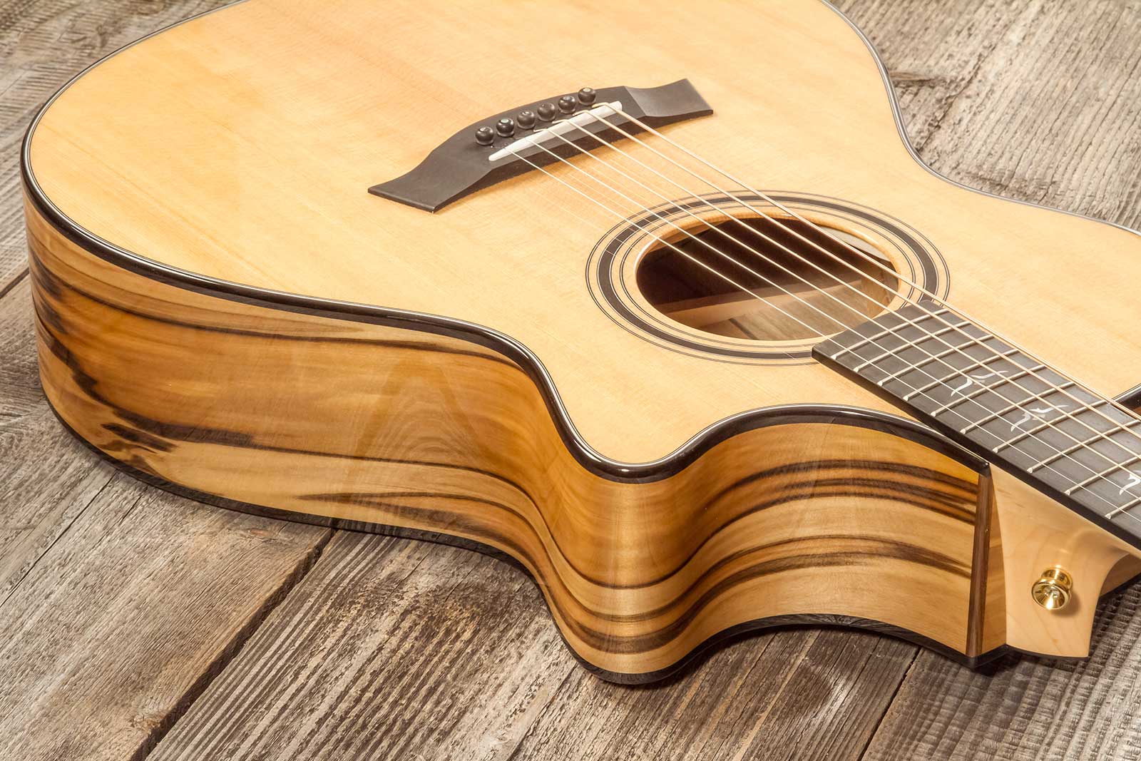 Cette guitare folk électro-acoustique de type Grand Concert avec pan coupé est constituée d'une table en Epicéa Sitka torréfié, d'un combo dos/éclisses en Blackheart Sassafras, d'un manche en Erable et d'une touche en Ebène.