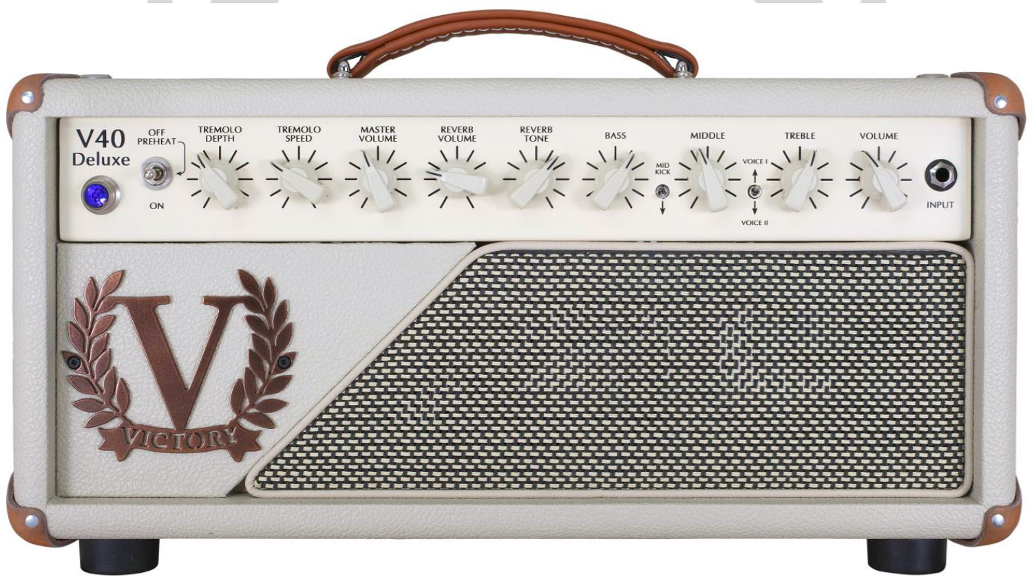Fabriqué à la main en Angleterre la tête guitare électrique tout lampes mono-canal VICTORY Heritage Series V40H Deluxe avec réverbération à ressort et tremolo est un rêve de Bluesman : sons clairs à l'américaine ou crunchs vintage British, ses sonorités sont toujours chaudes, généreuses et subtiles.